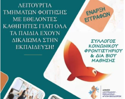 Ξεκίνησαν οι εγγραφές για το Κοινωνικό Φροντιστήριο του Δήμου Λουτρακίου – Περαχώρας – Αγίων Θεοδώρων για το διδακτικό έτος 2025-26