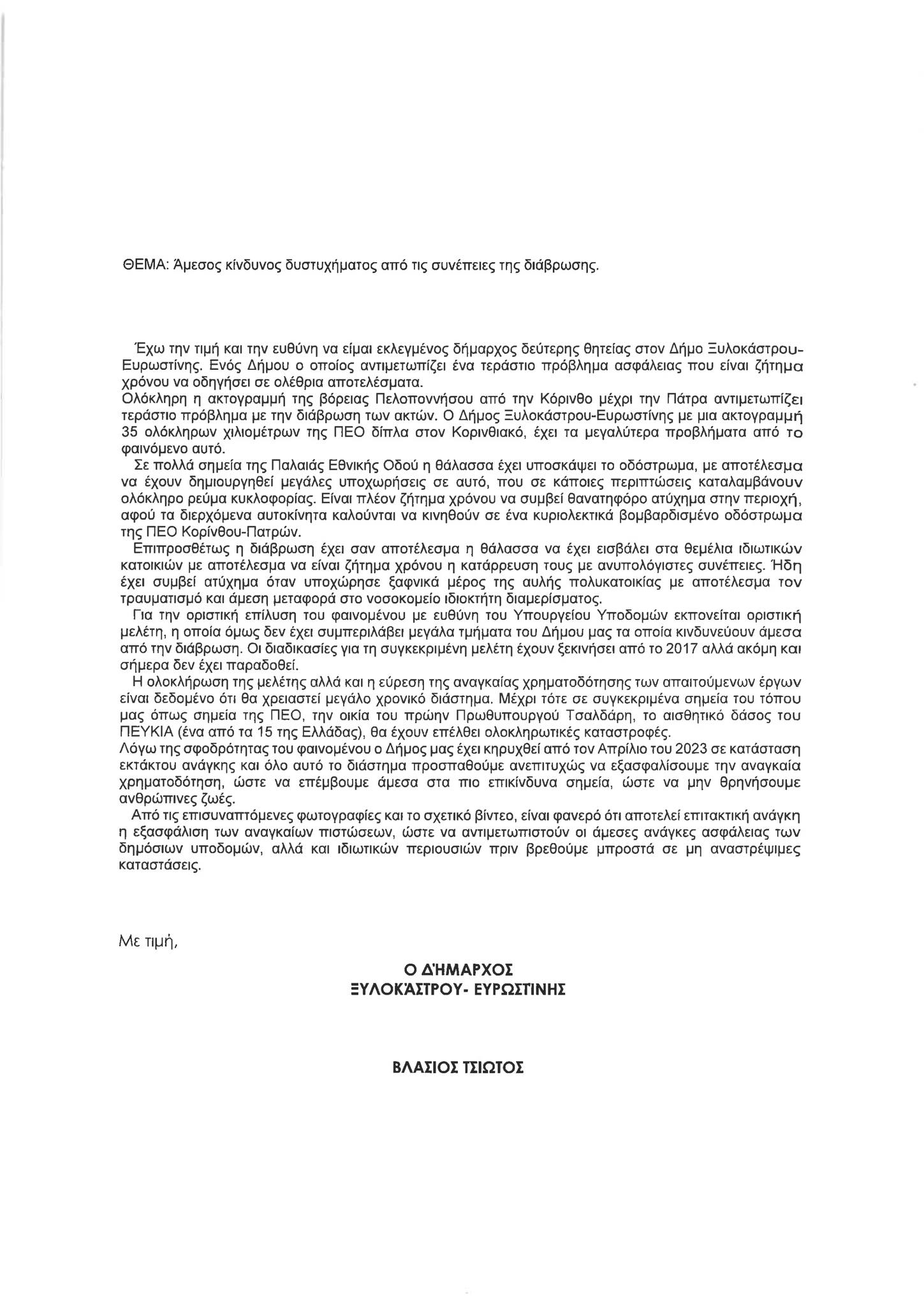 Ο Δήμαρχος Ξυλοκάστρου - Ευρωστίνης Βλάσης Τσιώτος δηλώνει: