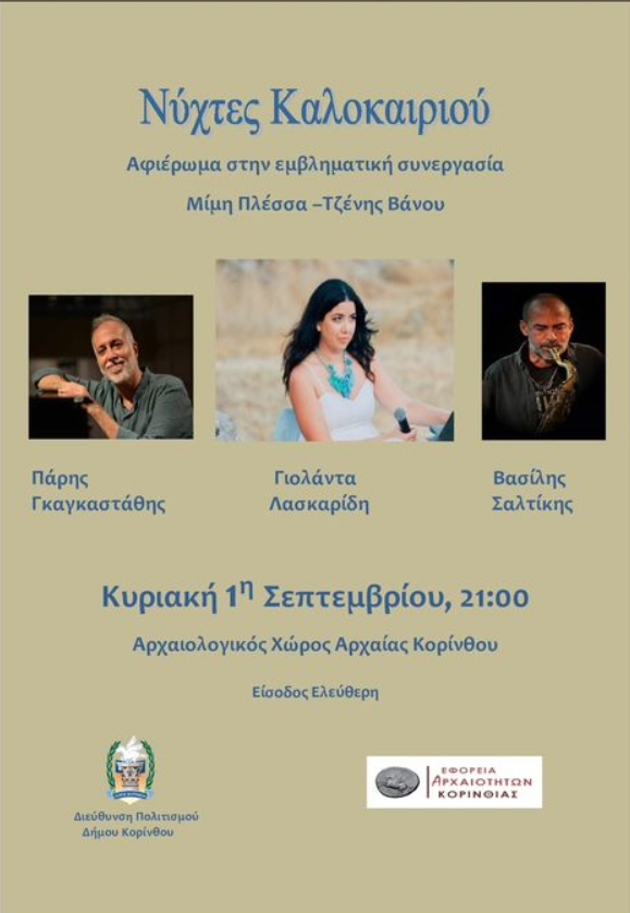 Κυριακή, 1 Σεπτεμβρίου, 9.00, Αρχαιολογικός Χώρος Αρχαίας Κορίνθου: Νύχτες Καλοκαιριού και μια ακόμη μουσική βραδιά - αφιέρωμα στον Μίμη Πλέσσα και την Τζένη Βάνου. Με τους Γιολάντα Λασκαρίδη, Πάρη Γκαγκαστάθη, Βασίλη Σαλτίκη.