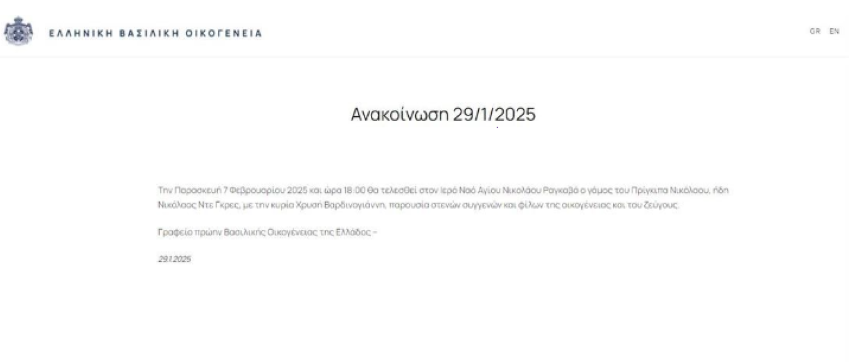 «Την Παρασκευή 7 Φεβρουαρίου 2025 και ώρα 18:00 θα τελεσθεί στον Ιερό Ναό Αγίου Νικολάου Ραγκαβά ο γάμος του Πρίγκιπα Νικόλαου, ήδη Νικόλαος Ντε Γκρες, με την κυρία Χρυσή Βαρδινογιάννη, παρουσία στενών συγγενών και φίλων της οικογένειας και του ζεύγους».